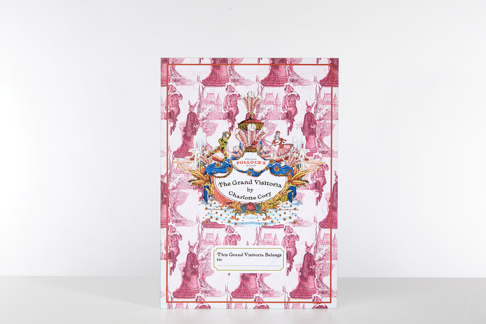 The pack contains an illustrated sheet of the ‘Grand Visitoria’ story by Charlotte Cory, 6 black and white x A4 prints including 5 plates to colour in and 1 x theatrical frame created using an original Victorian toy theatre wooden printing block. Also included are a pack of gold ‘dresdens’ - scraps for ‘tinselling’ your portrait. The 2025 artists folder includes a sheet of either gold moons or suns from Covent Garden neighbour and stationery heaven 'Choosing Keeping'.